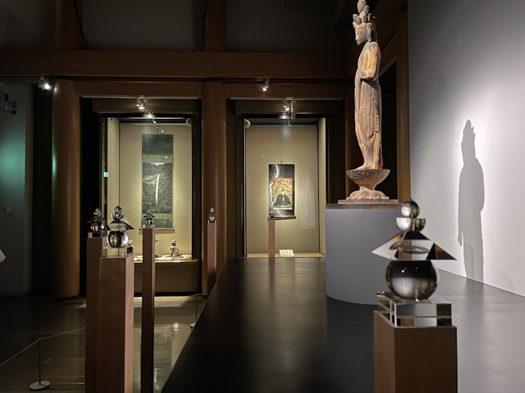 《十一面観音像》は普段、杉本が自宅で展示しているもの。彩色の省略で素地仕上げとなっていることや、細部の彫刻の省略などから平安時代の「神像」であると考えられている。それを取り囲むように並んだ光学硝子の五輪塔が、より神秘的な雰囲気を醸し出す。