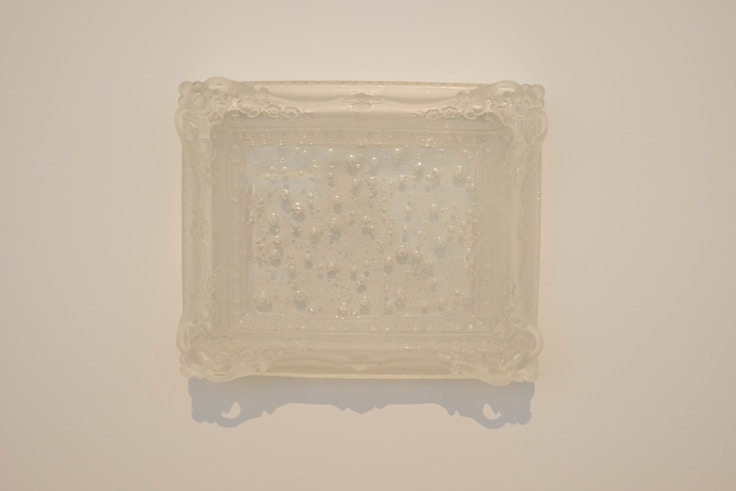 「Kanda & Oliveira」は、美術ギャラリーには珍しく、展示室に外光をふんだんに取り入れる構造となっている。エントランスを入ってすぐ、1階の展示室は吹き付け工法による壁と道路に面した細長い窓が特徴だ。この部屋で注目したいのは、会田誠《滝の絵》(2007-10)の下絵(2006)だろう。会田のキャリアを語るうえでは欠かせない作品の、貴重な下絵を見られる機会となる。また、窓辺には青木美歌のガラス作品《Bergaberg》(2015)が展示されており、時間とともに変化する日差しによって、作品が様々な表情を見せる様子を楽しめる。