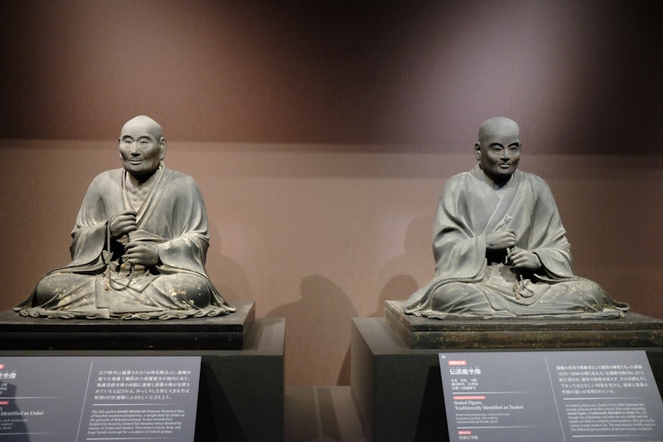 また、平清盛の像と伝えられる鎌倉時代の《伝平清盛坐像》は、僧侶の姿で巻物を持って座った、独特の姿勢でつくられている。その姿をふくめていまだ成立に謎が多いという本像だが、鎌倉幕府成立後に清盛の鎮魂のために造像されたと考えられている。