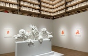 《Fountain》の反対側には、昭和初期から日本の小学校に数多く設置されてきた「二宮金次郎像」をモチーフとした「Velvet–Kinjiro」シリーズが出現。背の順に並べられたこのシリーズでは、オブジェの表面を部分的に膨らせ、全体を真っ黒なベルベット状に仕上げている。本を読みながら歩いている金次郎の像をモチーフにした作品は、銀座 蔦屋書店店内に並べられた多数の書籍にも呼応している。