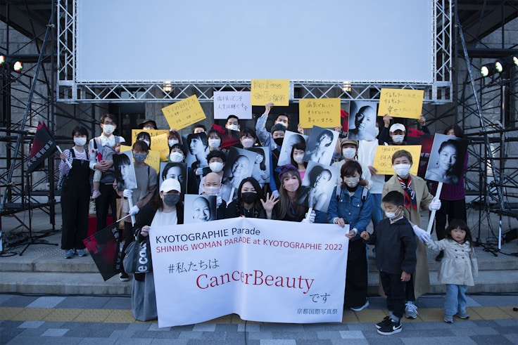 西陣織で知られるHOSOO GALLERYで開催されている「10/10 現代日本女性写真家たちの祝祭」の参加作家・殿村任香のもうひとつの展示が、アソシエイテッドプログラム「SHINING WOMAN PROJECT at KYOTOGRAPHIE 2022」として祇園のSferaで展開している。がんと闘い向き合う女性を称えるべくポートレートを撮影し、SNSで公開するプロジェクト「SHINING WOMAN #cancerbeauty」を続けている。そこには、がんと闘い生きることを選択した女性の美しさを称えたい思いと、乳房や頭髪を失うなど、がんによって“女性のシンボル”を失った女性への偏見や差別への抗議とが込められている。
