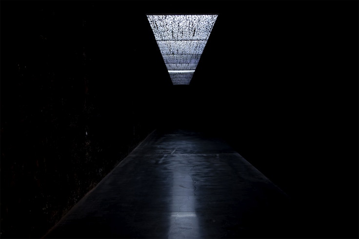 弘前れんが倉庫美術館の展示では、最初の展示室から次の通路、そして高さ15メートルの吹き抜けという建築構造を見て、プランはすぐに決まったというほどに美術館と呼応した作品の並びだ。通常であれば床にカーペットを敷くところを、あえてそうせずに展示全体で音が響き合い、また同館特有の倉庫だったコールタールの壁面もその無骨さが池田の光と音の表現にマッチする。