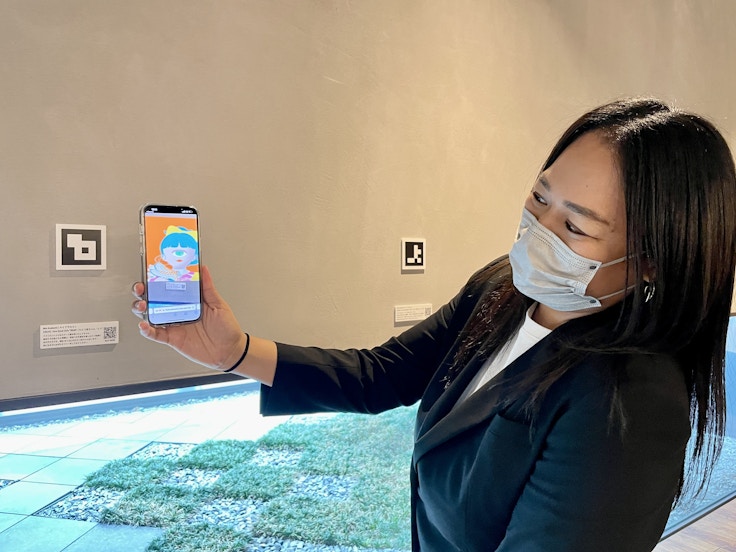 本展では、館内のフロントやエグゼクティブラウンジなどの場所で合計16個のARマーカーが展示。それぞれのマーカーをスマートフォンで読み込むことで、拡張現実上で表示されている作品を鑑賞することができる。