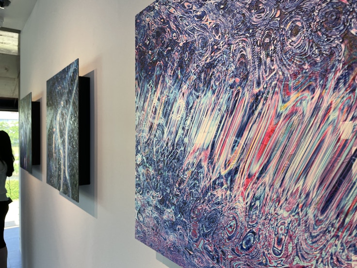近年ますますアート分野での活動を積極的に行う落合陽一は、「Study:大阪関西国際芸術祭」で発表し注目を集めた「Re-Digitalization of Waves」シリーズを中心に展示。「Re-Digitalization of Waves」は、空中に浮遊する鏡面の彫刻が風景を切り取って回転させ、人間の魂と風景を写し取るインスタレーション《借景,波の物象化》を原型としたもの。物質的なインスタレーションをオールドレンズとデジタルカメラを用いて映像として撮影し、動き(揺らぎ)のある視覚的なNFTとして再度デジタル化した作品群だ。