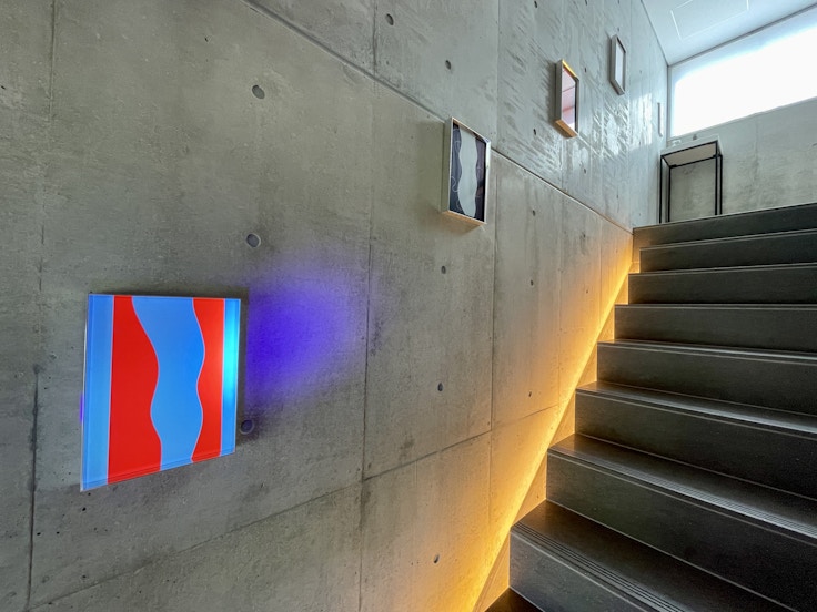 ドイツ出身のレギーネ・シューマンは、蛍光顔料を混入させた独自のアクリル板を使用し、絵画とオブジェとのあいだに位置する作品で知られるアーティスト。本展では、代表的な蛍光顔料を混入させた特殊なアクリル板を使った作品群を展示する。また階段に展示された「フルオ・カット」シリーズでは、鑑賞者がブラックライトを当てることでその色合いの揺らぎを楽しみたい。