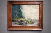 例えば川久保正名は、大蔵省に務める官僚でありながらも、日本の洋画家の草分けとされる國澤新九郎に師事した異色の画家だ。川久保は自身の画塾である「勧画学舎」で陶芸家の板谷波山を門下に持つなど後進の育成にも力を注いだが、明治37年頃に日光に寄宿して以降の足どりは明らかになっていない。展示されている《海岸燈台之図》(1902)は、第5回内国勧業博覧会の出品作でもあり、須磨別邸の海を望む部屋に飾られたという。