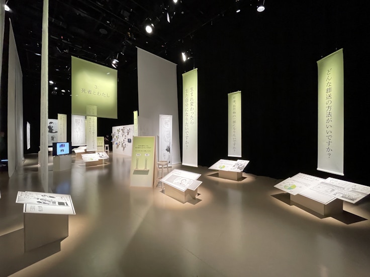 会場には、「生まれ変わりたいですか?」など、死や人生に関するさまざまな問いをが大きく掲げられ、各質問と関連する「名作マンガの1シーン」がセットで展示されている。