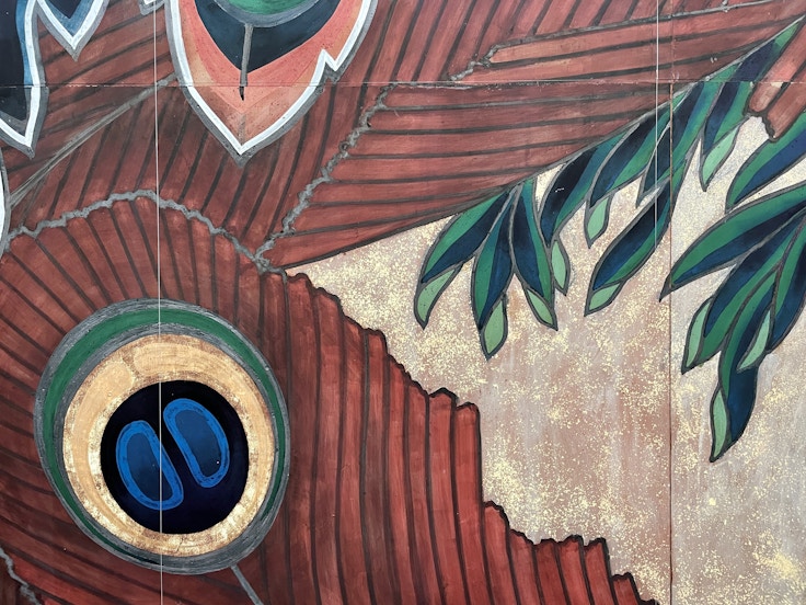 第3章では、こうしたDTIP技術を活用し、岩松院本堂天井絵「鳳凰図」を実物大で再現したマスターレプリカを見ることができる。原作にある凹凸や筆致、色調などが正確に再現されるいっぽう、経年により原作のパネルに生じた割れ目やズレまで忠実に反映されている。