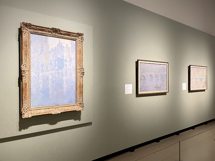 第1章「空を流れる時間」では、絶えず変化し続ける自然の諸相をテーマに、「雲」「風」「雨」「雪」「霧」などの気象を表現した作品が集まる。「空の王者」と称されたウジェーヌ・ブーダンがノルマンディーの海辺のリゾート地を描いた《トルーヴィルの浜》(1867)《引き潮のドーヴィルの浜》(1893)からはじまり、「嵐の海」というテーマを抑えた色調で表現したエドゥアール・マネ《嵐の海》(1873)や、朝霧がかかり、画面全体が青く描かれたクロード・モネ《ルーアン大聖堂のファサード(朝霧)》(1894)へと展開していく。