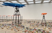 「まわるワニ」や「後退するクマ」、「登山する山」「バタバタ音を立てる布」など、機械仕掛けの作品を制作することで知られる現代美術家・タムラサトル。その個展「ワニがまわる タムラサトル」が国立新美術館で始まった。
