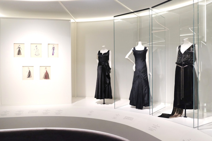 展覧会冒頭では、20年代に制作された絹のジャージーやクレープといったやわらかな生地によるドレスやジャケット、ブラウスを紹介。素材から身体の動きやすさを重視するシャネルの思想を伺うことができるだろう。