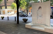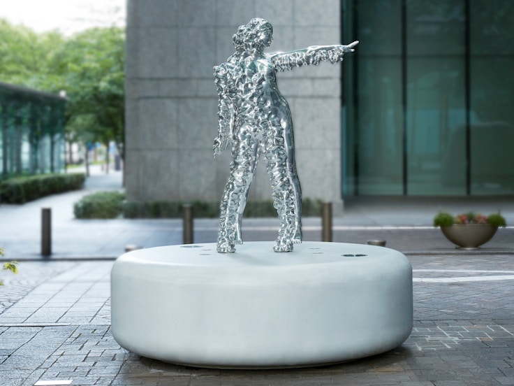 名和晃平《Trans-Double Yana(Mirror)》は2012年に制作した作品を、今回のストリートギャラリーのために台座を新たにし、新作として丸ビルの裏手に設置したものだ。3Dスキャンしたポリゴンの表面にエフェクトをかけ、そのデータを再び実体化させることでつくられた本作。情報データの表皮によってそのディティールはかたちづくられており、現代における実存を問いかける。