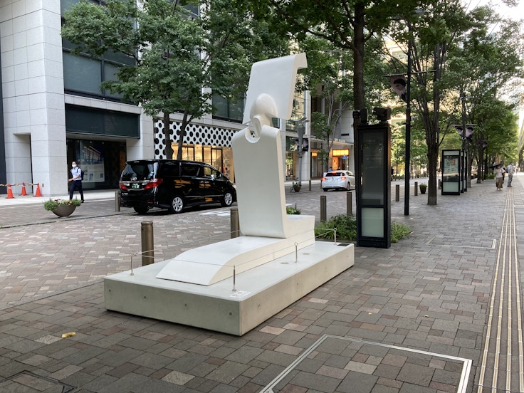 また、東京スカイツリーのデザイン監修でも知られ、「そりのあるかたち」を追求してきた彫刻家・澄川喜一の作品は、馬場先通りとの交差点付近で見ることができる。《白のマスク》(1969)は「MASK」シリーズのひとつで、有機的なかたちとシャープなフォルムが組み合わされ、構造を強く感じさせる彫刻となっている。