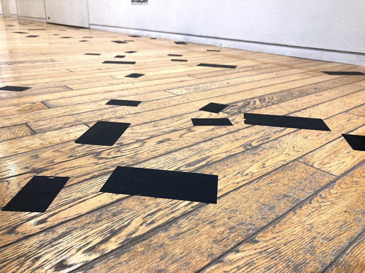 床面に目をやれば、黒いカッティングシートの四角形が散りばめられていることに気がつくだろう。会場入口から続いているこれらのシートのシルエットは、すべてカードをかたどったもので、《野望をもってしても埋められない詩に足りないもの》(2019-2020)と名づけられている。かたどられているのは、クレジットカード、IDカード、航空券、タイムカードなどで、こうしたカードが持つ個人のアイデンティティと、時間を消費することの関係性を示唆している。