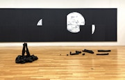 まるで上空から落ちてきて、床を破壊した瞬間に静止したかのようなステンレス製の立体作品《編集は高くつくので》(2016)も目を引く。本作は直線を基調とした抽象彫刻で知られる彫刻家、ジョルジュ・ヴァントンゲルロー(1886〜1965)の作品を編集したもので、ヴァントンゲルローの彫刻の直線がアルゴリズムを通してすべて曲線に変換されており、もととなった彫刻とは真逆のやわらかな曲線で構成される立体作品となった。また、ガンダーは本作の破壊されているかのように見える床面を「モダニズムの象徴」と語っている。