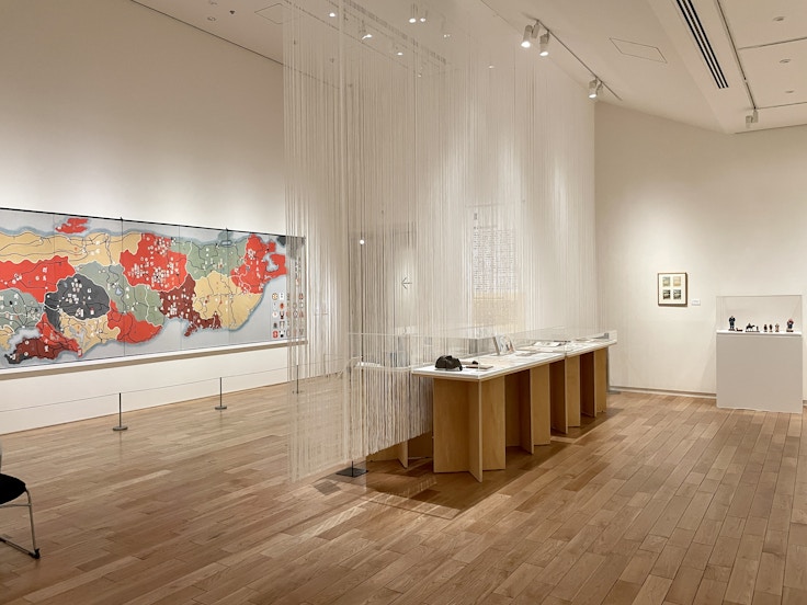 2章では、東北を「驚くべき富有な地」や「民藝の宝庫」としてとらえた柳宗悦(1889〜1961)の活動を紹介。民藝運動を提唱し、手工芸のなかに「生活に即した」「健康的な」独自の美を見出した柳は、1927年から44年までに20回以上、東北を訪れている。芹沢銈介が制作した《日本民藝地図(現在之日本民藝)》に始まった同章では、柳が東北各地で収集した蓑、刺子、陶芸などの品々や、芹沢、棟方志功らの作品が展示されている。