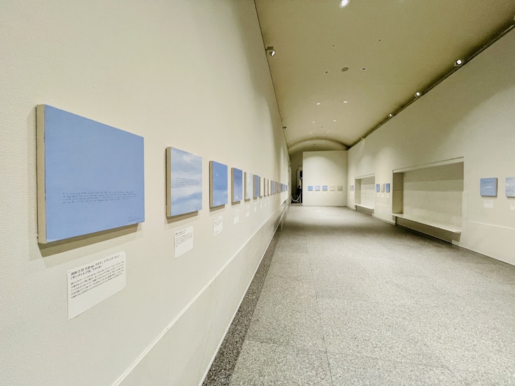 河原温の「デイト・ペンディング」からも影響を受けているバイロン・キムの《サンデー・ペインティング》(2020-2021)はその名の通り、「日曜絵画」だ。キムはコロナが始まった2020年2月から21年2月にかけ、毎週日曜日の空を描いた。そこにはその時々の状況や心情を示すテキストが記録されており、非常にパーソナルな行いがキャンバスに留められている。