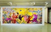 有松・鳴海絞りの伝統が受け継がれる東海道沿いの町並み保存地区である有松地区。歴史を感じさせるこのエリアでは、8つの家々の軒先がミット・ジャイインの作品《ピープルズ・ ウォール(人々の壁)2022》(2022)で彩られる。リボン状の絵画は、絞り染めの反物が屋外で風にたなびく様子や店先の暖簾に着想を得たもの。地域の歴史や伝統文化、生活のなかに絵画を共存させるとともに、西洋的ではないキャンバスの使い方によって、権威主義に抗う市井の人々の力を象徴する。