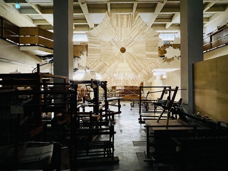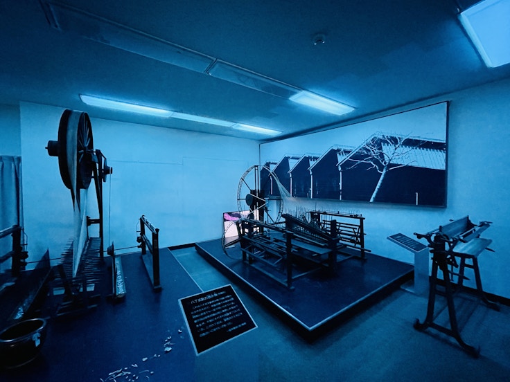 一宮は羊毛による毛織物で国内最大の生産量を誇る。歴史的な織機を多数収蔵・展示する豊島記念資料館では、遠藤薫が羊をテーマに2フロアにまたがる大規模なインスタレーション《羊と眠る》(2021-2022)を展開する。