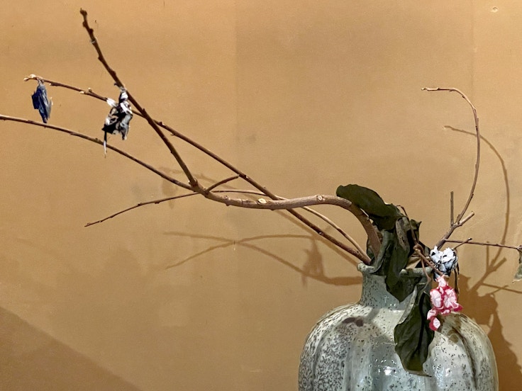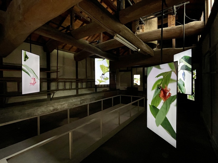 一棟の建物としては最大規模を誇る岡家住宅。人間界を超えた生命との関わりや、そこから生まれるものを探求する作品で高い評価を受けるAKI INOMATAは、職人の技と虫の生態を融合させた映像作品《彼女に布をわたしてみる》(2021)を発表。括られた布がミノムシの蓑に似ていると考えたINOMATAは、有松絞りの生地をミノムシに与え、ミノムシは蓑(巣筒)をつくりあげた。映像には有松・鳴海絞りの蓑を纏いながら葉を食べるミノムシの様子が映し出されている。