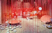 もうひとつの展示会場は、1973年に建てられ2016年頃まで営業していた中華料理屋「中華園」の跡地だ。かつては多くの人々で賑わいを見せていたこの店舗。ここではその記憶を甦らせるように、実際に使われていた円卓や膨大な食器、岡持ち、そして棚などの家具などが、塩田特有の赤色の糸によってつながれ、空間を埋める。宙を舞う食器の数々は、往時の活気をいまに伝えるようだ。