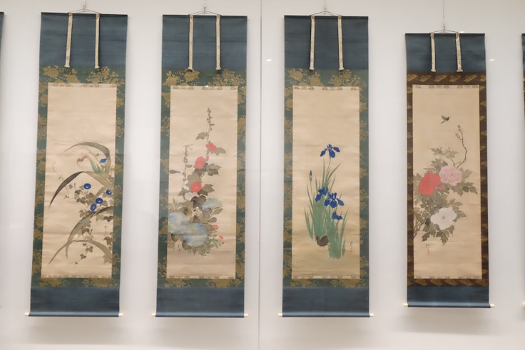 酒井抱一の《花鳥十二ヶ月図》(江戸時代、1823)は全12幅が展示され、各月ごとの花や鳥の生き生きとした様子を楽しむことができる。