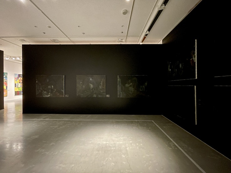 1996年の「赤の時代」に続く横尾の転機となった、2000年の「Y字路」シリーズ。これは、夜の闇に浮かぶY字路を描いたものだが、そこには必然的に「黒」が多用されてきた。とくに2010年の「黒いY字路」シリーズは、Y字路シリーズの描写としてはひとつの到達点とされている。本展ではあえて照明を当てずに黒い作品を黒い壁面に展示することで、黒という色をより際立たせている。