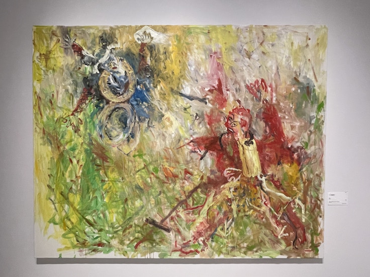 こうした黒のY字路を抜けると、カラフルなY字路をはじめとする作品群が現れる。横尾は「暗く人通りのない夜のY字路」という自ら定めたY字路のルールを破り、キャンバスは色彩豊かなパレットと化している。このセクションでは、横尾の高校生時代の作品である《飾磨港風景》(1954-55)や、2021年に描かれた新作《二刀流再び》など、色彩あふれる作品にも注目だ。