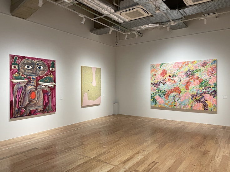 隣のSPACE 4では、鮮やかな色彩や生命力にあふれた作品を制作している近藤亜樹の絵画作品群を展示。「家族」をテーマにした幸福で満ち溢れる《HOUSE》(2017)や、2021年に初の作品集『ここにあるしあわせ』の刊行にあわせて都内の4ヶ所で展覧会が開催された際に生まれた大型の作品《星、光る》(2021)などが、逞しく生きる力を見せている。