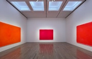 展覧会は、巨大なキャンバスに蛍光塗料で描かれた3連画《風景I》《風景II》《風景III》(いずれも1968/2015)から始まる。1968年に東京国立近代美術館で開催された「韓国現代絵画」展に出品されたこれらの初期代表作では、ピンク、赤、オレンジと色味が微妙に異なる塗料が用いられ、天井や床にも光が広がり空間全体を染め上げている。