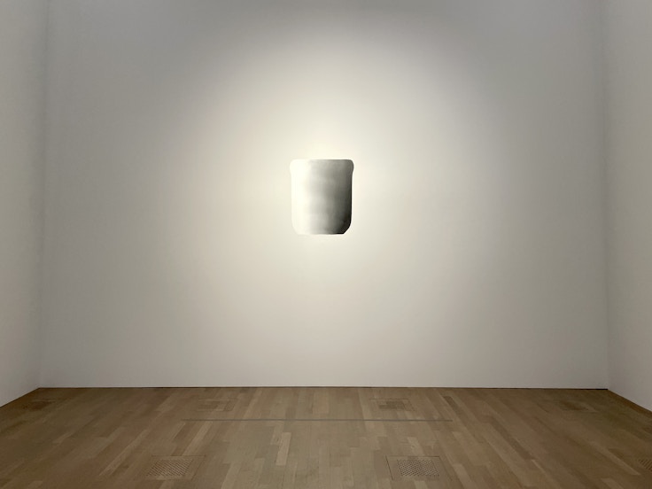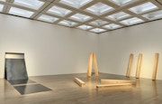 例えば、展覧会の冒頭で展示された《関係項(於いてある場所)Ⅰ 改題 関係項》(1970/2022)は、5枚の鉄板が壁から床へドミノ倒しのように少しずつ位置をずらしながら設置され、最後の2枚は水平に床に置かれている。鉄板という素材の重さや硬さなどの特性を直観的にうかがうことができる。