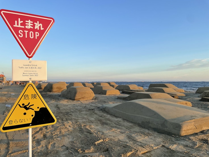 サマソニの面白いポイントは、ビーチにもステージが設置されているところだ。ビーチへ向かうと、金沢21世紀美術館の恒久設置作品《スイミング・プール》でも有名なアルゼンチンのアーティスト、レアンドロ・エルリッヒの作品に出会うことができる。その作品《Traffic Jam 交通渋滞 2022》は、ビーチの砂で40台もの車の交通渋滞を表現した巨大な作品だ。「未来の視点から現代を見たときに、このような遺跡が発掘されるのではないか?」という想像のもと制作されており、気候変動の問題にも着目した作品と言える。