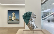 静物画の作品と同じ展示室で展示された彫刻の新作2点は、ギリシャのオリンピア考古学博物館に所蔵されるギリシャの神の彫刻と、フィレンツェのサン・ロレンツォ教会に所蔵されるミケランジェロの彫刻の一部をモデルにして制作したもの。表面にパテ処理を施したブロンズと磨き上げられた光沢のあるステンレスを組み合わせることで、「時間のなかに浮かんでいる」「過去と未来が混在している」ような感覚を呼び起こしている。