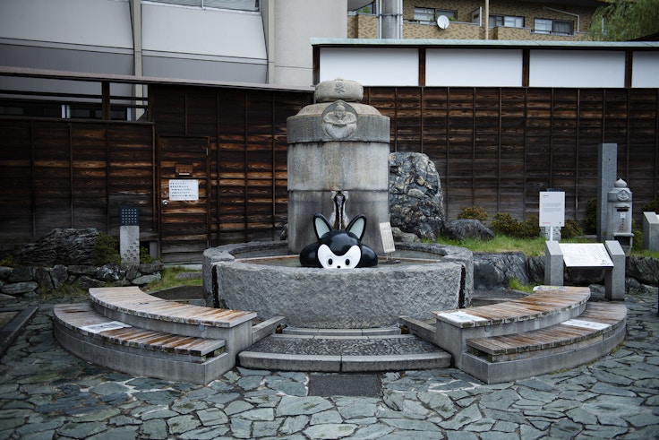 市原の作品からすぐのところに位置する「放生園」足湯には、TIDEの代表的アイコンであるCATが立体となって出現。道後の湯から突如CATが現れたようなストーリーを想起させる。普段はペインティングに描かれるCATが、この場所では立体となり、さらには商店街の中ほどでは壁画として表現されている。