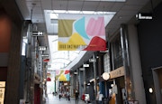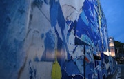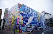 商店街を飛鳥乃湯泉と反対方向に向かうと、色鮮やかな画が目に入ってくる。道後温泉本館に展開する大竹伸朗の《熱景/NETSU-KEI》だ。大竹が自家製色紙を指でちぎり貼り合わせる「ちぎり絵」の手法で手がけた5枚の原画を約25倍に拡大し、ターポリン素材に高精細プリントして完成させたテント膜が道後温泉本館の建屋を覆っている。「ちぎり絵」の立体感が再現された細部に驚かされるが、それ以上に、道後温泉本館のサイズでどのような絵が立ち上がるのかを想定して手がけたであろう大竹の、縮尺感覚は圧巻だ。道後地区のさまざまな地点に足を運び、道後温泉本館を包みあげた壮大な作品を異なる角度から楽しむことができる。