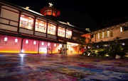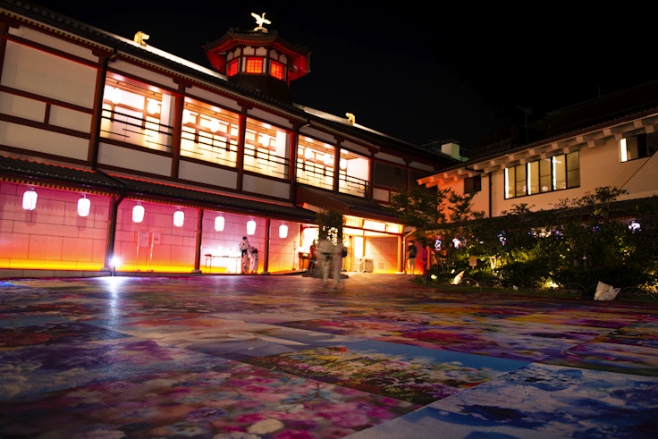 Lの字形の商店街の角に突き当たり、左手すぐの場所に位置するのが公営浴場「道後温泉 椿の湯」と「道後温泉別館 飛鳥乃湯泉」だ。その飛鳥乃湯泉中庭の「ハダカヒロバ」には、蜷川実花が初の試みとして、屋外の床面に約230点の花の写真を敷き詰めたインスタレーションを展開する。昼には鮮やかに日の光を受け、夜には浴衣姿で温泉を訪れる観光客を引き寄せている(展示は2024年2月29日まで継続予定)。