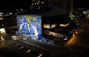 道後オンセナートのバナーで彩られた道後商店街を進むと、その中ほどで交差する路地を入ったところで2点の作品と出会う。TIDEがCATを壁画として描いた《Mural #1》と、東京を拠点とするドイツ出身の建築家でCGI(Computer Generated Imagery)アーティストのエイドリアン・シュテッケヴェーによる《あいだのお湯》だ。シュテッケヴェーの作品では、路地の建物の窓に水紋に揺らぐような映像が浮かび上がっており、鑑賞者の動きが投影されてインタラクティブに温泉街の風情を感じられる。