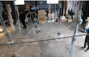 同じ鉄工所の奥では、梅田哲也もインスタレーションを展開。廃業したガソリンスタンドから譲り受けた「ガラス玉」に光が反射し屈折する。