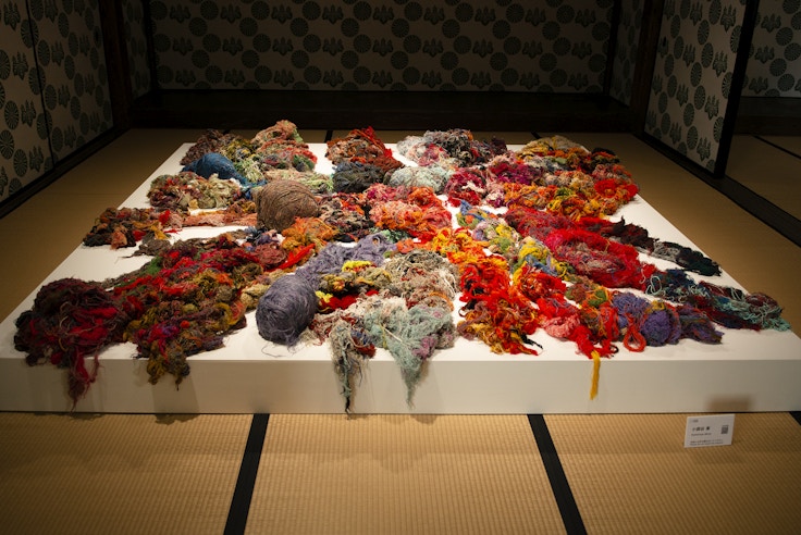 対面には、西陣織の老舗織屋に生まれ、西陣織の新たな表現を目指す細尾真孝が、アーティストでプログラマーである古舘健とともにプログラミングのコードにより生成した織の作品を展示。シルク、レーヨン、銀糸、銀箔を融合させたシャープな織りが、麻の柔らかな風合いとは対称をなす。