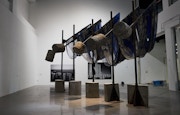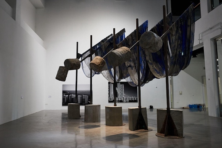 1944年イギリス生まれのバーロウは、半世紀以上にわたってコンクリート、鉄筋、木材、合板などの安価な工業素材による作品を制作してきた。このたび新たに発表された《Untitled: Bluecatcher; 2022》では、釜山の漁船が使っているのと同じ網が集められ、液状のコンクリートに浸されたうえで鉄柱に立て掛けられている。