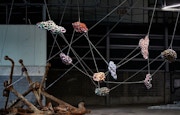 チェーンのうえには彫刻が括り付けられており、互いの自重でバランスを取り合っている。その様子は、いずれかひとつでも欠けてしまうと構造全体が崩れ落ちてしまう均衡を物語っている。また背後に見える巨大な錨は、会場である第1埠頭に放置されていた船で実際に用いられていたものだとのことだ。