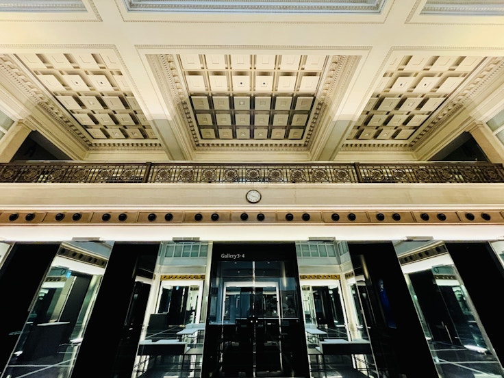 美術館が位置するのは明治生命館の1階。以前はラウンジとして使用されていた部分だ。改修工事と設計は、明治生命館の建設・大規模改修工事を手がけてきた竹中工務店が担っており、竣工当時の雰囲気を生かした落ち着いたデザインとなっている。