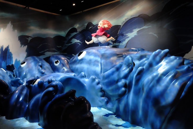 まずは、企画展示から紹介したい。「ジブリのなりきり名場面展」は、スタジオジブリ作品の登場人物になりきり、各作品の名場面のなかに入り込めるという趣向の展示だ。『千と千尋の神隠し』の電車内、『紅の豚』の決闘の場面、『崖の上のポニョ』の波の上を走るポニョなど、各作品を象徴する場面を立体で表現。さながら作品に入り込んだかのような写真を撮影することができる。