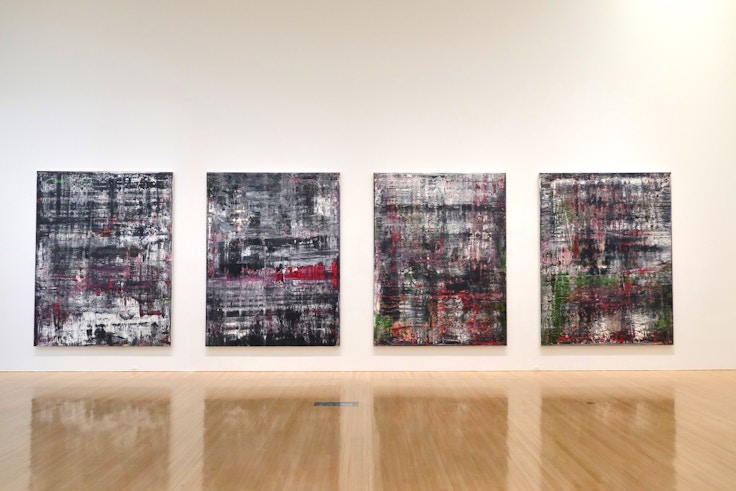 本展はリヒターが大切に手元に残してきた作品群を中心に、60年にわたる画業を紹介するもの。幅2メートル×高さ2.6メートルの作品4点で構成される巨大な抽象画《ビルケナウ》(2014)をはじめ、60年代の「フォトペインティング」やドローイング、そして豊田会場のみで展示される2022年の最新作など、あわせて約140点が展示されている。