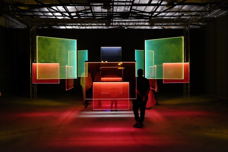 展覧会の冒頭に展示されているプエルトリコの作家、ギーゼラ・コロン(Gisela Colon)の《Rectanguloid(Qasar Spectrum)》(2022)は、本展を象徴する作品といえる。鮮やかに発光しているような本作だが、電装はいっさい行われていない。アクリル素材を重ねることにより、見る角度によって様々に色彩が変化する本作は、反射という光の本質や、テクノロジーによって光をつくり出してきた人類の歴史も照射しているといえる。本展の光をどこまでもポジティブにとらえる志向を、この小さな作品に見出せるはずだ。