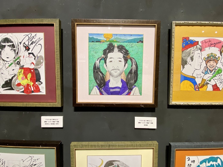会場は「中村佑介展 BEST of YUSUKE NAKAMURA」(2020年)に続き、Gallery AaMo。足を踏み入れるとまず、「ASIAN KUNG-FU GENERATION」「さだまさし」といったアーティストのCDジャケットが並ぶ。完成イラストと原画が並ぶことで線と着彩の個性が感じられるほか、完成までの過程も紹介するパネルや壁一面に引き伸ばされたイラストレーションなど、見どころ満載だ。