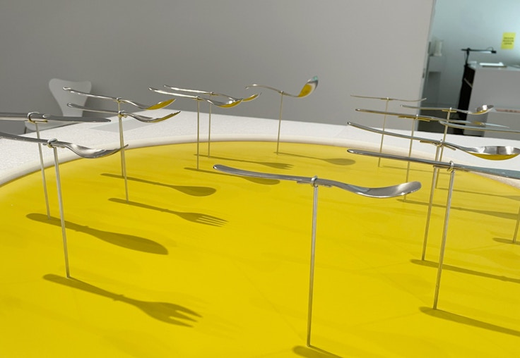 デザイナーたちのデザインプロセスに興味があるという田川欣哉は、戦後日本を代表するインダストリアルデザイナー・柳宗理の工房を訪ねるため、石川県金沢美術工芸大学にある柳宗理記念デザイン研究所に向かった。そこで田川は、柳のものづくりが「スケッチ」からではなく、「実際に紙や木で試作する」ところから始まっていたことを目の当たりにした。本展では、そのなかからカトラリーを例にデザインプロセスを紹介するとともに、柳のデザインに対する信条も明記されている。