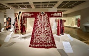 日本の白無垢の展示から始まる「慶びと哀しみの赤と白」では、成年儀礼や婚礼、葬礼など日常とは異なる日に身につける衣服を展示。19世紀以降白色が定着したイギリスのウェディングドレスのほか、トルクメニスタンで婚礼の際に多用される赤色の衣装も展示され、色の持つ意味が多様であることが示される。