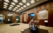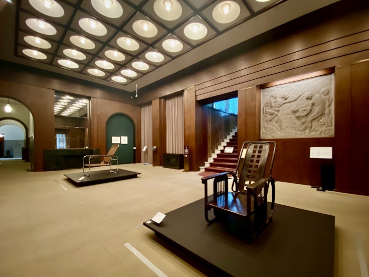 第1章では、ウィーン工房設立者のひとりであるヨーゼフ・ホフマンのテキスタイルデザインやポール・ポワレの衣装を通して、大戦前のドイツ、オーストリア、フランスの動向を紹介。大食堂の構成は、同館と調和するアール・デコの作品で構成されている。