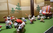 会場では、冠をつけた七福神たちの「宝船曳」「輿行列」「鯛車曳」「楽隊」「餅つき」の5グループ・計58体の御所人形が列を成すように展示されており、その和気藹々とした様子を楽しむことができる。